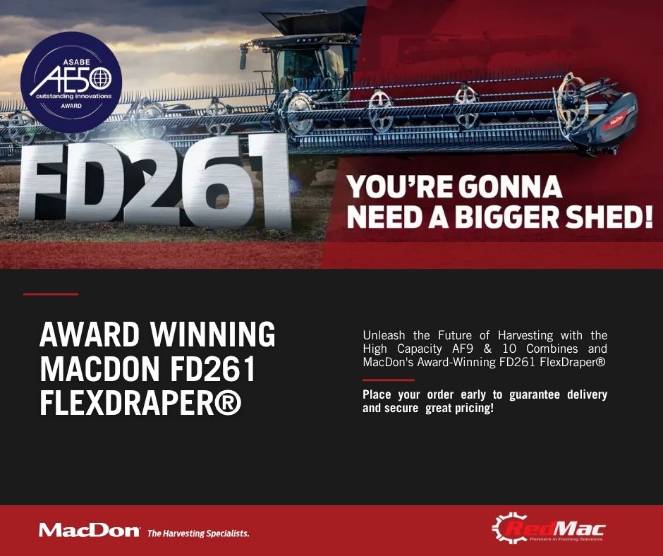 MacDon has been honoured with the prestigious 2025 AE50 award for its outstanding product, the FD261 FlexDraper header. This innovative header has been celebrated for its remarkable engineering and technology advancements. Developed over two years, the FD261 was designed to meet market demand for a wider header than the previous 50-foot FD250 series. This need arose with the introduction of larger class 10+ combines, particularly in regions with lower yields such as Australia and Western Canada.