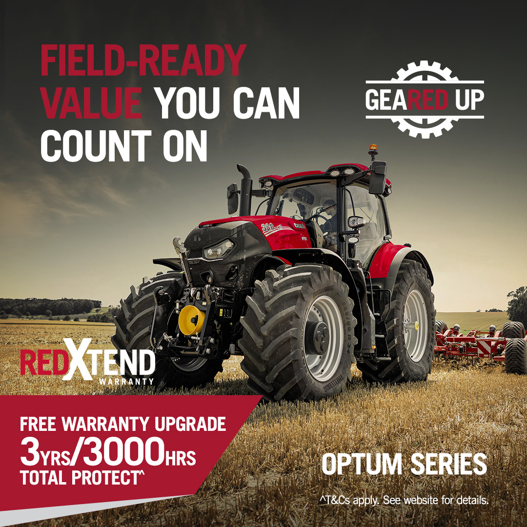 ^The Case IH Geared up additional RedXtend Total Protect warranty applies to Puma and Optum models purchased between 18 August 2025 and delivered by 31 December 2025. This coverage includes 2 years / 2,000 hours manufacturerโs factory base warranty, plus additional 1 year / 1,000 hours of Total Protect RedXtend warranty for a combined total of 3 years or 3,000 hours coverage, whichever occurs first. Full coverage is detailed in the Extended Warranty Terms and Conditions document. To redeem, complete the warranty registration with your Case IH dealer.